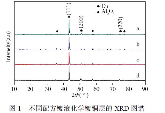 式中:D是晶粒尺寸(nm),K是形狀因子(0.89), λ 是X 射線的波長(zhǎng)(Cu 靶為0.15406 nm),β 是衍射 峰的半高寬。由公式(1)計(jì)算可得,a、b、c、d 四 種配比鍍液所得鍍銅層的晶粒尺寸分別為437、404、 427、315 nm,由此可知,鍍液中甲醛和硫酸銅含量 相對(duì)較低的d 配比鍍液可制備出晶粒更為細(xì)小的化 學(xué)鍍銅層。經(jīng)過對(duì)衍射峰進(jìn)行歸一化處理并進(jìn)行簡(jiǎn)單 定量分析發(fā)現(xiàn):采用a、d 配比鍍液得到的含銅鍍層 的氧化鋁基板樣品中銅的含量高于b、c 配比鍍液, 這間接反映出在同樣施鍍時(shí)間下,a、d 配比鍍液得 到的鍍銅層相對(duì)較厚。為了證實(shí)這一現(xiàn)象,采用涂層 測(cè)厚儀測(cè)量了a、b、c、d 配比鍍液制得鍍銅層的膜 厚,其厚度分別為49.6、41.2、36.1、43.2 μm,這與 XRD 的分析結(jié)果是一致的。此外,得到的鍍銅層為 面心立方結(jié)構(gòu),經(jīng)計(jì)算得到采用a、b、c、d 配比鍍 液制得的鍍層銅的晶格常數(shù)分別為0.3613、0.36077、0.36075、0.3615 nm,與ICSD 數(shù)據(jù)庫中的銅(PDF no. 89-2838)的晶格常數(shù)0.3615 nm 相比,a、d 鍍液配 比得到的銅鍍層與其更為相近,而b、c 鍍液得到的 銅鍍層的晶格常數(shù)略有所減小。