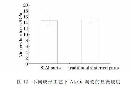 當(dāng)激光功率為200W、掃描速度為90mm/s時,對比SLM 與傳統(tǒng)燒結(jié)方法制備氧化鋁 的顯微維氏硬 度,如圖12所示。由圖可知,SLM 試樣的顯微維氏硬度均值約為14.7GPa,試樣具有較高的致密度,其 維氏硬度已接近傳統(tǒng)燒結(jié)制備的氧化鋁 硬度數(shù)值。
