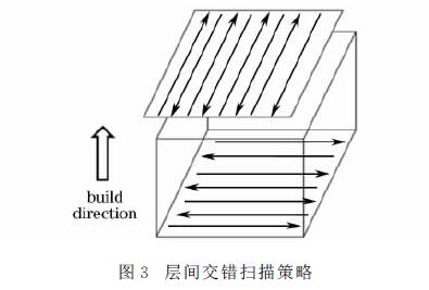 SLM 成形過程是一個復(fù)雜的物理變化過程。在前期大量實(shí)驗(yàn)基礎(chǔ)上,實(shí)驗(yàn)設(shè)置激光功率為100~ 200W,掃描速度為90mm/s,激光光斑約為60μm,層厚為50μm,掃描間距為50μm。采用層間交錯的掃 描方式,如圖3所示。成形的試樣截面尺寸為10mm×10mm。