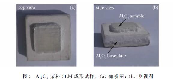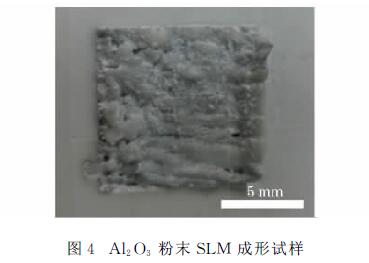 圖5為氧化鋁 漿料SLM 成形試樣,試樣大小為10mm×10mm,鋪粉20層。