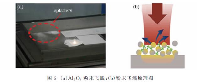 分析認(rèn)為,氧化鋁 粉末在瞬間高激光能量作用下,產(chǎn)生等離子體效應(yīng),反沖擊力很大,如圖6所示。粉末粒度 小、質(zhì)量輕,松散堆積下顆粒間接觸面積小,粘附力差,很易產(chǎn)生粉末吹散現(xiàn)象,因而氧化鋁 粉末獲得的成形 效果差。這與Shishkovsky等的研究結(jié)果一致。氧化鋁 漿料經(jīng)過110℃預(yù)熱后,大部分水分蒸發(fā),但由于 表面張力的作用,氧化鋁 顆粒表面仍吸附少量的薄膜水,水膜使得氧化鋁 顆粒聚合,反沖擊力較小的激光作用不足以使粉末飛濺。當(dāng)激光輻照時,會形成高溫?zé)嵴羝?,熱蒸汽加快了熱量的傳遞,使氧化鋁 陶瓷獲得足 夠的能量而快速熔化,因而試樣成形效果較好。