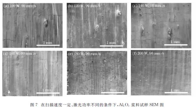 在掃描速度一定、激光功率不同的條件下,氧化鋁 漿料試樣表面形貌如圖7所示。由圖可以看出,當(dāng)掃 描速度恒為90mm/s,激光功率為100,120,140W 時,試樣存在裂紋且表面不平整,局部出現(xiàn)了凸起;隨著 激光功率的增加,表面平整性不斷提高,但裂紋依然存在;當(dāng)激光功率提高到200W 時,試樣表面沒有明顯 的氣孔和裂紋,形成了連續(xù)的掃描軌跡,相鄰掃描線間結(jié)合質(zhì)量較好。