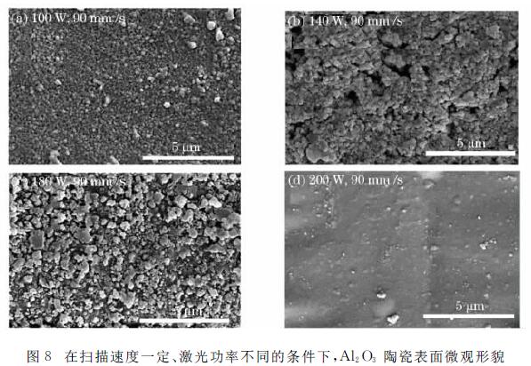 140W 時,粉末顆粒重新排列,孔洞變大;當(dāng)激光功率繼續(xù)提高到180W 時,大部分粉末熔化,孔洞被逐漸填 充,試樣致密度增加;當(dāng)激光功率為200W 時,陶瓷顆粒完全熔化,試樣表面無明顯孔洞。
